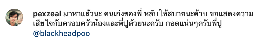 อย่างไรก็ตาม “เป็ก” นักร้องนำวง Zeal เพื่อนร่วมวงการและยังเคยเล่นคอนเสิร์ตด้วยกัน ก็คงไม่อาจจะทิ้งพี่ปูได้ ล่าสุดหนุ่ม “เป็ก” โพสต์ภาพสมาชิกวง Zeal นั่งเคียงข้าง พี่ปู หน้าโลงศพของ “นุ๊กซี่” พร้อมระบุข้อความว่า…มาหาแล้วนะ คนเก่งของพี่ หลับให้สบายนะค้าบ ขอแสดงความเสียใจกับครอบครัวน้องและพี่ปูด้วยนะครับ กอดแน่นๆครับพี่ปู @blackheadpoo