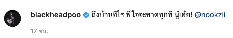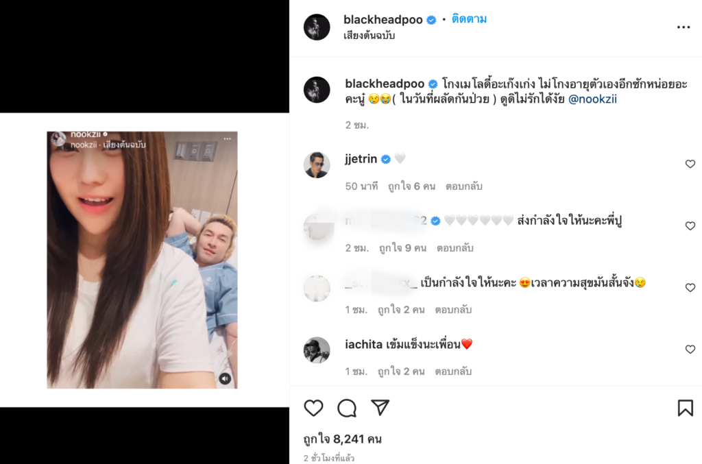 ล่าสุดหนุ่ม “ปู แบล็คเฮด” โพสต์คลิปและ ข้อความที่อ่านแล้วก็เศร้า เศร้าเกินจะรับไหว อย่างไรก็ตามต่อจากนี้ “ปู” คงทำได้เพียงเก็บภาพความทรงจำดี ๆ เพื่อเป็นกำลังใจและเดินหน้าต่อไป คลิปแรกนั้นหนุ่มปู โพสต์และระบุแคปชั่นว่า “ถึงบ้านทีไร พี่ใจจะขาดทุกที นู๋เอ้ย! @nookzii.”
