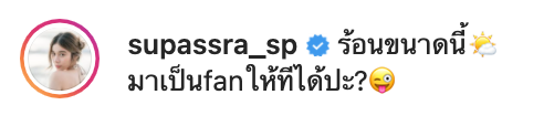 และล่าสุดกับแคปชั่น ที่ต้องบอกเลยว่า น่าตีจริง ๆ พอบวกกับความน่ารักของเธอยิ่งน่ารักทวีคูณ โดยเธอระบุข้อความเอาไว้ว่า…” ร้อนขนาดนี้🌤 มาเป็นfanให้ทีได้ปะ?😜 “