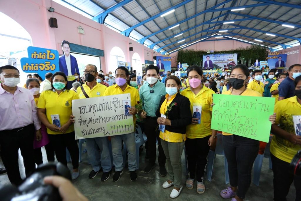 นายจุรินทร์ กล่าวว่าสมัยที่ตนมาเป็นรัฐมนตรีว่าการกระทรวงพาณิชย์แรกๆ ผลปาล์มกิโลกรัมละ 2 บาทกว่า ประกันรายได้ที่กิโลกรัมละ 4 บาท ถ้าต่ำกว่า 4 บาท จะมีส่วนต่างโอนเข้าบัญชี ธ.ก.ส.ให้เท่ากับ 4 บาท ตามราคาประกันรายได้ แต่ปัจจุบันเราแก้ปัญหาให้ปาล์มราคาดีขึ้น วันนี้ที่นี่ 10 บาทกว่าแล้ว นอกเหนือจากปัจจัยราคาน้ำมันปาล์มในตลาดโลกที่สูงขึ้น มีส่วนทำให้ราคาผลปาล์มปรับเพิ่มขึ้นแล้ว ตนได้พาพ่อค้าไปเปิดตลาดส่งออกน้ำมันปาล์มที่อินเดีย 2 ครั้ง ทำให้ปริมาณการส่งออกน้ำมันปาล์มไปอินเดียเพิ่มขึ้นถึง 438% อย่างไรก็ตาม เมื่อผลปาล์มราคาแพง ต้นทุนการทำน้ำมันปาล์มขวดก็แพงขึ้นไปด้วย โดยตามโครงสร้างราคาควรอยู่ที่ขวดละ 68-70 บาท แต่เราพยายามขอความร่วมมือบริษัทผู้ผลิตน้ำมันปาล์มไว้ ทำให้ราคาขายน้ำมันปาล์มขวดเฉลี่ยทั่วประเทศยังอยู่ที่ขวดละ 63.34 บาท น้ำมันถั่วเหลือง 64.22 บาทและเรื่องราคายางพารา วันนี้ดีขึ้น ยางก้อนถ้วยหรือขี้ยาง ราคาล่าสุดเฉลี่ยทั่วประเทศอยู่ที่ 26.50-27 บาท/กก. ซึ่งสมัยก่อนขี้ยางกิโลกรัมละ 10 บาท ซึ่งทุกอย่างดีขึ้น