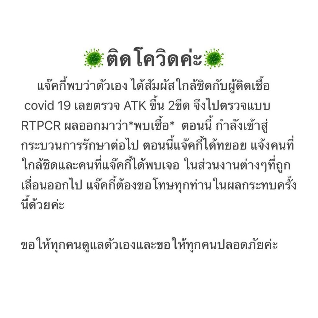 “ติดโควิดค่ะ แจ๊คกี้พบว่าตัวเอง ได้สัมผัสใกล้ชิดกับผู้ติดเชื้อ covid 19 เลยตรวจ ATK ขึ้น 2ขีด จึงไปตรวจแบบ RTPCR ผลออกมาว่า *พบเชื้อ* ตอนนี้กำลังเข้าสู่กระบวนการรักษาต่อไป ตอนนี้แจ๊คกี้ได้ทยอย แจ้งคนที่ใกล้ชิดและคนที่แจ๊คกี้ได้พบเจอ ในส่วนงานต่างๆที่ถูก เลื่อนออกไป แจ๊คกี้ต้องขอโทษทุกท่านในผลกระทบครั้ง นี้ด้วยค่ะ ขอให้ทุกคนดูแลตัวเองและขอให้ทุกคนปลอดภัยค่ะ”