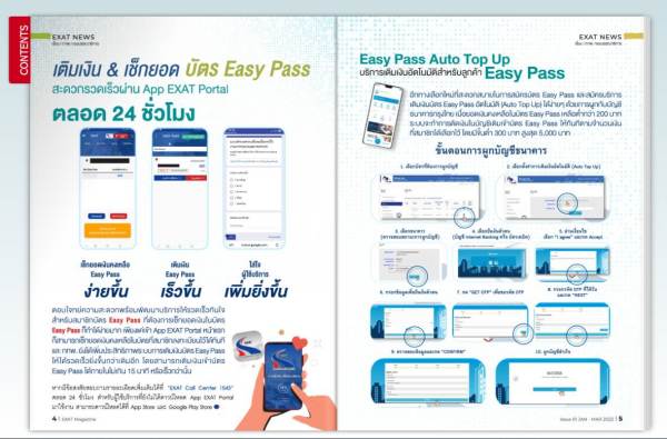 การทางพิเศษแห่งประเทศไทย (กทพ.) ได้ดำเนินการจัดทำ วารสาร “EXAT Magazine” สื่อกลางในการเผยแพร่ประชาสัมพันธ์ข้อมูลข่าวสาร ในรูปแบบ eBook เพื่อสร้างความเข้าใจอันดีแก่ผู้ใช้บริการทางพิเศษอย่างมีประสิทธิภาพ ซึ่งปัจจุบันได้มีการพัฒนา “รูปแบบ” และ “เนื้อหา” ของวารสารให้มีความน่าสนใจ และทันสมัยมากขึ้น สอดคล้องกับวิสัยทัศน์ของ กทพ.ที่ว่า “องค์กรนวัตกรรมเพื่อการเดินทางและคุณภาพชีวิตที่ดีขึ้น” (Innovation for better drive and better life)