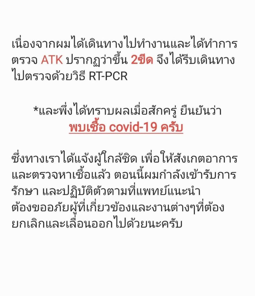 “ไม่รอดครับซีซั่นนี้ เนื่องจากผมได้เดินทางไปทำงานและได้ทำการตรวจ ATK ปรากฏว่าขึ้น 2 ขีด จึงได้รีบเดินทางไปตรวจด้วยวิธี RT-PCR *และพึ่งได้ทราบผลเมื่อสักครู่ ยืนยันว่าพบเชื้อ covid-19 ครับ ซึ่งทางเราได้แจ้งผู้ใกล้ชิด เพื่อให้สังเกตอาการและตรวจหาเชื้อแล้ว ตอนนี้ผมกำลังเข้ารับการรักษา และปฏิบัติตัวตามที่แพทย์แนะนำต้องขออภัยผู้ที่เกี่ยวข้องและงานต่าง ๆ ที่ต้องยกเลิกและเลื่อนออกไปด้วยนะครับ”