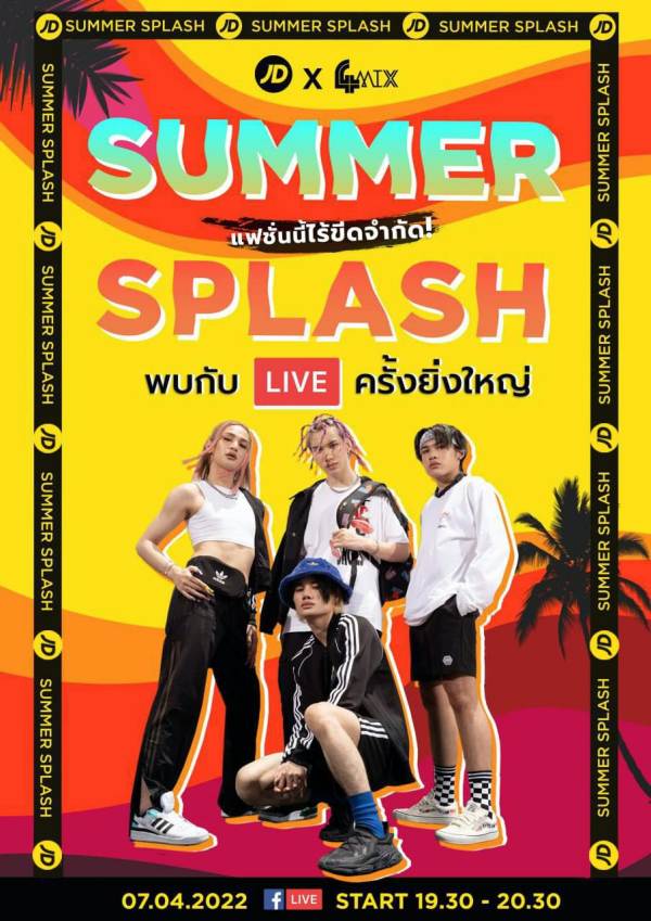 โดยงานนี้ทั้ง 4 คน ขอมาจัดเต็มความสดใส พร้อมกับเตรียม Special Show สุดต๊าซ!! ให้แฟน ๆ 4MIX รอกรี๊ดในความเท่แบบสุดจึ้ง และยังมีสัมภาษณ์พิเศษแบบเอ็กซ์คลูซีฟ ล้วงลึกถึงสไตล์การแต่งตัวของหนุ่ม ๆ 4MIX อีกด้วย นอกจากนี้ยังมี Fashion Show คอลเลคชั่นใหม่ กับ “Splash Collection” แฟชั่นสุดว้าวรับซัมเมอร์ พร้อมร่วมสนุกกับเกมแจกของรางวัลในระหว่าง Live แบบจัดเต็ม งานนี้แฟนๆ 4MIX ห้ามพลาดเด็ดขาด เตรียมรอชมแฟชั่นแบบไร้ขีดจำกัดของทั้ง 4 คนได้เลย ในวันพฤหัสบดีที่ 7 เมษายน เวลา 19.30-20.30 น. ทางเพจ Facebook “JD Sports Thailand” https://www.facebook.com/jdsportsthailand