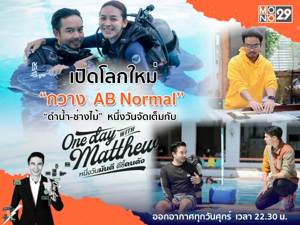 จากนั้นหนุ่ม กวางเอบี เลยชวนพิธีกร แมทธิว ไปลุยมัน ๆ ให้เต็มหนึ่งวันที่โรงเรียนสอนดำน้ำต่อ โดยมีแฟนสาว “น้ำหวาน” ซาซ่า-พิมรา เจริญภักดี รอฝึกพร้อมก่อนลุยทริปดำน้ำออกเรือยาว ๆ นับสิบวัน ติดตามหนึ่งวันเข้ม ๆ จัดเต็มแบบนี้ได้ในรายการ “วัน เดย์ วิท แมทธิว หนึ่งวันมันดี ตีซี้คนดัง (One Day With Matthew)” วันศุกร์ที่ 15 เมษายนนี้ เวลา 22.30 น. เป็นต้นไป ทางช่อง MONO29