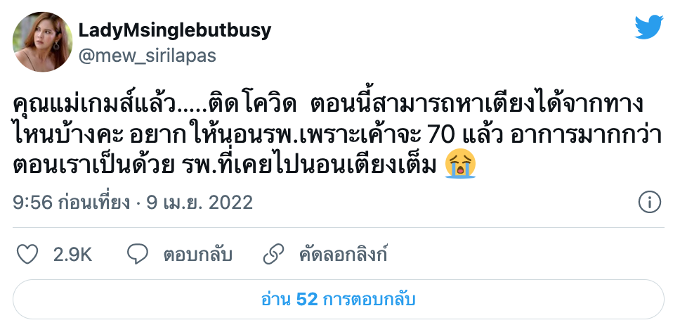 “คุณแม่เกมส์แล้ว…..ติดโควิด ตอนนี้สามารถหาเตียงได้จากทางไหนบ้างคะ อยากให้นอนรพ.เพราะเค้าจะ 70 แล้ว อาการมากกว่าตอนเราเป็นด้วย รพ.ที่เคยไปนอนเตียงเต็ม 😭”