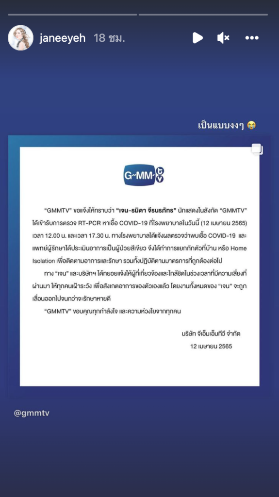 GMMTV ขอบคุณทุกกำลังใจ และความห่วงใยจากทุกคนบริษัท จีเอ็มเอ็มทีวี จำกัด 12 เมษายน 2565