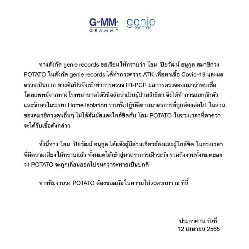 ล่าสุด ต้นสังกัดออกจดหมายแถลงการณ์ แจ้งข่าวว่า โอม-ปิยวัฒน์ อนุกูล สมาชิกวง POTATO ติดเชื้อโควิด ซึ่งแพทย์ได้ประเมินอาการเป็นผู้ป่วยสีเขียว และให้ทำ Home Isolation ที่บ้าน ซึ่งต้นสังกัดมีการยกเลิกงานทั้งหมดของวงแล้วและคนที่มีความเสี่ยงก็ให้กักตัวอีกด้วย