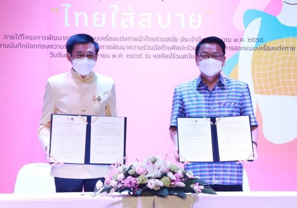 รศ.ดร.สมเดช รุ่งศรีสวัสดิ์ ประธานหลักสูตรนิเทศศาสตรดุษฎีบัณฑิต และคณบดีวิทยาลัยสหเวชศาสตร์ มหาวิทยาลัยราชภัฏสวนสุนันทา ลงนามความร่วมมือร่วมกับสำนักงานศิลปวัฒนธรรมร่วมสมัย กระทรวงวัฒนธรรม พร้อมด้วย 6 สถาบันการศึกษา ในโครงการประกวดออกแบบเครื่องแต่งกายร่วมสมัย (Contemporary Fashion Competition 2022) ภายใต้แนวคิด “ไทยใส่สบาย” เพื่อเสริมศักยภาพนักออกแบบรุ่นใหม่ ขับเคลื่อนอัตลักษณ์เครื่องแต่งกายไทยและสร้างรายได้แก่ชุมชน โดยมี นายโกวิท ผกามาศ ผู้อำนวยการสำนักงานศิลปวัฒนธรรมร่วมสมัย เป็นประธานเปิดงาน