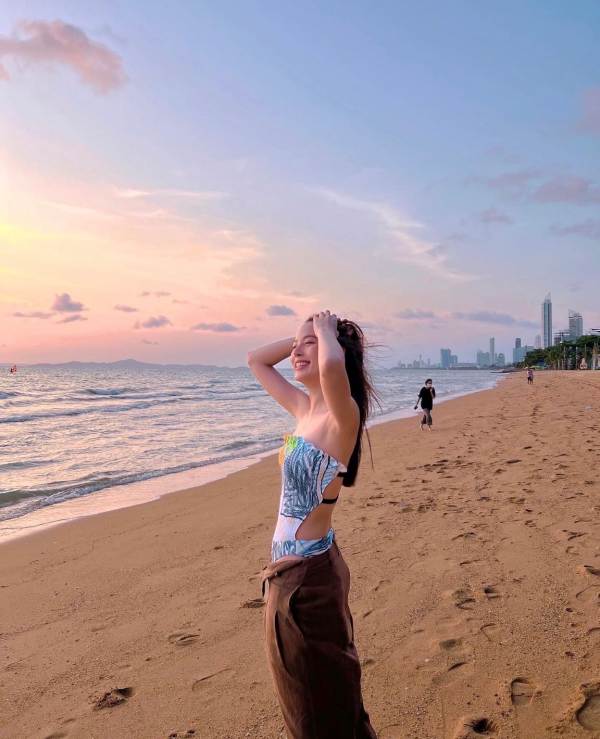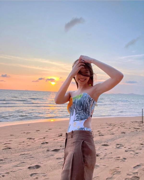 เริ่มต้นกันที่นางเอกสาว ณิชา–ณัฏฐณิชา ดังวัธนาวณิชย์ มาในชุดว่ายน้ำวันพีซเกาะอกแบบ High-class sexy ตัดเย็บด้วยเทคนิกสม็อคแต่งระบายพิมพ์ลายแมว คอลเลกชั่น Spring/Summer 2022: FROM DIARY TO CANVAS แมตช์กับกางเกงขายาวสีน้ำตาล เดินเล่นชิลล์ ๆ ริมทะเล ชมวิวพระอาทิตย์ตกดิน