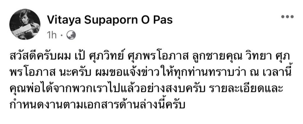 “สวัสดีครับผม เป้ ศุภวิทย์ ศุภพรโอภาส ลูกชายคุณ วิทยา ศุภพรโอภาส นะครับ ผมขอแจ้งข่าวให้ทุกท่านทราบว่า ณ เวลานี้ คุณพ่อได้จากพวกเราไปแล้วอย่างสงบครับ รายละเอียดและกำหนดงานตามเอกสารด้านล่างนี้ครับ”