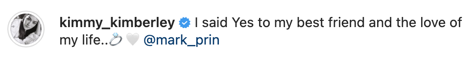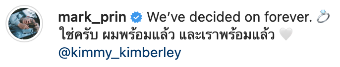 โดยในไอจีหมาก ปริญ ได้โพสต์ภาพสวีทหวาน จูบมือคิมเบอรี่ที่สวมแหวนเพชรเม็ดโตไว้ที่นิ้วนางซ้ายพร้อมแคปชั่นว่า “We’ve decided on forever ใช่ครับ ผมพร้อมแล้ว และเราพร้อมแล้ว และแท็กไอจีว่าที่ภรรยาอย่าง คิมเบอร์ลี่”