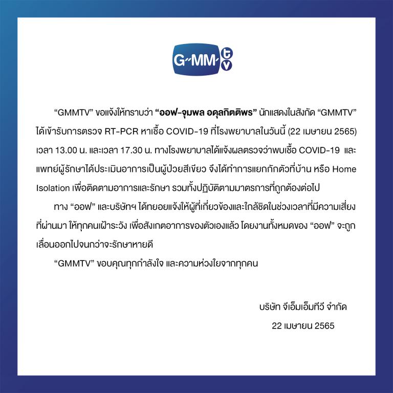 GMMTV ขอแจ้งให้ทราบว่า ออฟ-จุมพล อดุลกิตติพร นักแสดงในสังกัด GMMTV ได้เข้ารับการตรวจ RT-RCR หาเชื้อ COVID-19 ที่โรงพยาบาลในวันนี้ (22 เมษายน 2565) เวลา 13.00 น. และเวลา 17.30 น. ทางโรงพยาบาลได้แจ้งผลตรวจว่าพบเชื้อ COVID-19 และแพทย์ผู้รักษาได้ประเมินอาการเป็นผู้ป่วยสีเขียว จึงได้ทำการแยกกักตัวที่บ้าน หรือ Home Isolation เพื่อติดตามอาการและรักษา รวมทั้งปฏิบัติตามมาตรการที่ถูกต้องต่อไป