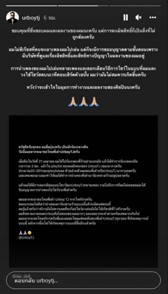 จากกรณีที่นักร้อง นักแต่งเพลง แร็พเปอร์คนดัง UrboyTJ โพสต์ข้อความผ่านไอจีสตอรี่ ระบุว่า…การเอาเพลงของผมไปเล่นทั้งโชว์โดยไม่ขอเจ้าของ เป็นการกระทำที่น่ารังเกียจมากเลยนะครับ ก๊อบปี้ โชว์ทั้งโชว์ วิธีเล่น Playlist และเล่นเพลงผมแทบจะทั้งอัลบั้ม ถ้ามีเวลาว่างขนาดนั้น ทำไมไม่แต่งเพลงเองหรอครับ