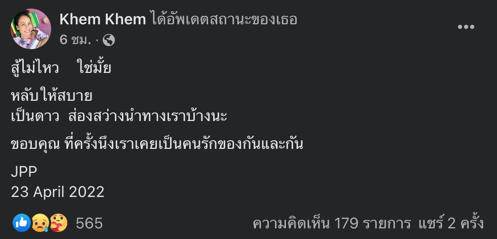 ล่าสุด “เข็ม” รุจิรา ช่วยเกื้อ อดีตเคยคบหากับ “เจย์” โพสต์ข้อความผ่านเฟซบุ๊กส่วนตัว Khem Khem ระบุว่า…