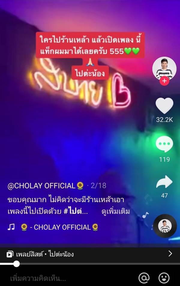ต้องยอมรับว่าเป็นปีทองของ “โชเล่ย์ ชคัทพล สุภาพ” สังกัด “ข้าวสารซาวด์” ก็ว่าได้ เพราะตั้งแต่ผลงานซิงเกิ้ลแรกในชีวิต “ไปต่ะน้อง” ได้ปล่อยออกมา นอกจากจะสามารถทำยอดวิวสามารถแตะหลักล้านในเวลาอันรวดเร็วแล้ว เสน่ห์ของเพลงนี้ยังทำให้แฟนเพลงชาวใต้ร้องตามกัน หรือโคฟเวอร์กันเยอะมากด้วย