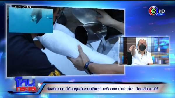 อัจฉริยะ : ใช่ เลยบอกว่าอันนี้เป็นไปไม่ได้ แล้วด้านขวางโดนสองขา ขาซ้ายขาขวา แล้วทำไมต้องไปโดนด้านหลัง ถ้าจะโดนต้องโดนด้านข้างสองข้าง ทำไมไปโดนหลังน่องด้วยล่ะ เหมือนแตงโมเป็นลูกมะพร้าว ทิ้งรอบวงเลยเหรอ ไม่ใช่สิ เราเป็นวิศวกรมา 30 ปี เป็นไปไม่ได้เลยที่แตงโมจะไปคร่อมตรงมอเตอร์ จะคร่อมยังไง คร่อมไม่ได้ ดูแนวร่องใบพัดมีสามใบ กับบาดแผลที่ให้ดูวันนั้นมันก็ไม่เหมือน ที่มันเหมือนบั้งปลา แล้วมันไม่ได้แผลลึก มันตื้น ถ้าโดนใบพัดเรือมันเหวอะหมดแล้ว