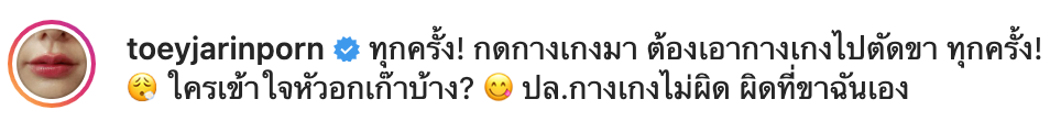 โดยเธอนั้นโพสต์ภาพตัวเองใส่กางเกงโดยขากางเกงนั้นยาวมาก ๆ เลยทีเดียว โดยระบุแคปชั่นไว้ว่า…”ทุกครั้ง! กดกางเกงมา ต้องเอากางเกงไปตัดขา ทุกครั้ง! 😮💨 ใครเข้าใจหัวอกเก๊าบ้าง? 😋 ปล.กางเกงไม่ผิด ผิดที่ขาฉันเอง”