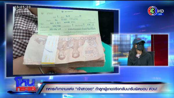 กรณีที่ “ทิพย์” อายุ 40 ปี สาวโรงงานในเขตนิคมอุตสาหกรรมกบินทร์บุรี พร้อมครอบครัวได้เข้าแจ้งความร้องทุกข์ต่อเจ้าหน้าที่ตำรวจ และร้องเรียนต่อสื่อมวลชนหลังถูกแฟนหนุ่มที่อ้างเป็นทหารยศ จ.ส.อ. คบหาดูใจกันมาตั้งแต่ปลายปี 2564 ทำงานเป็นบอร์ดี้การ์ดให้นักการเมืองท้องถิ่นในพื้นที่หลอกให้จัดพิธีมงคลสมรสเมื่อวันที่ 1 พ.ค.ที่ผ่านมา แต่พอถึงเวลากลับไร้เงาเจ้าบ่าวร่วมพิธี จนทิพย์ต้องเข้าพิธีเพียงคนเดียว ด้านครอบครัวต้องเป็นหนี้เกือบ 3 แสนบาท