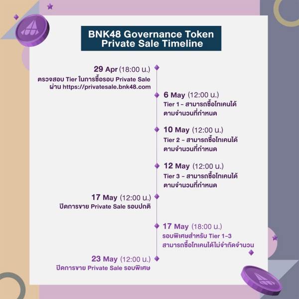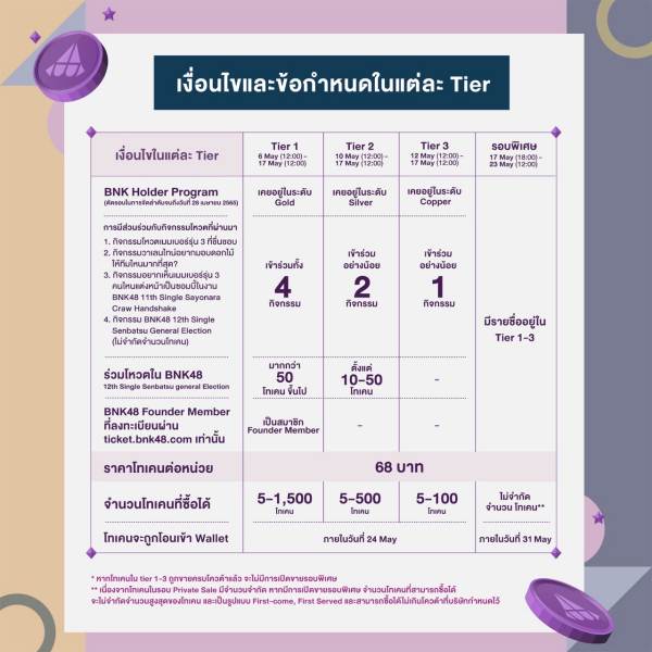 อย่างไรก็ตาม ผู้สนับสนุนสามารถตรวจสอบลำดับ หรือ tier โดยใช้ wallet code ตรวจสอบผ่าน privatesale.bnk48.com ได้ตั้งแต่วันที่ 29 เมษายน 2565 เวลา 18:00 เป็นต้นไป และพร้อมเปิดให้จองซื้อสำหรับ tier 1 ตั้งแต่วันที่ 6 พฤษภาคม2565 tier 2 ตั้งแต่วันที่ 10 พฤษภาคม 2565 และ tier 3 ตั้งแต่วันที่ 12 พฤษภาคม 2565 โดยทั้ง 3 ลำดับจะปิดการจองซื้อพร้อมกันวันที่ 17 พฤษภาคม 2565 โดยในแต่ละ tier จะมีการจำกัดจำนวนการซื้อโทเคนไว้ โดยจะมีการเปิดรอบพิเศษอีกครั้งให้สำหรับทั้ง 3 tier แบบไม่จำกัดจำนวนอีกครั้งในวันที่ 17 พฤษภาคม 2565 เวลา 18:00 ถึงวันที่ 23 พฤษภาคม2565เวลา 12:00 น. (เที่ยงตรง)