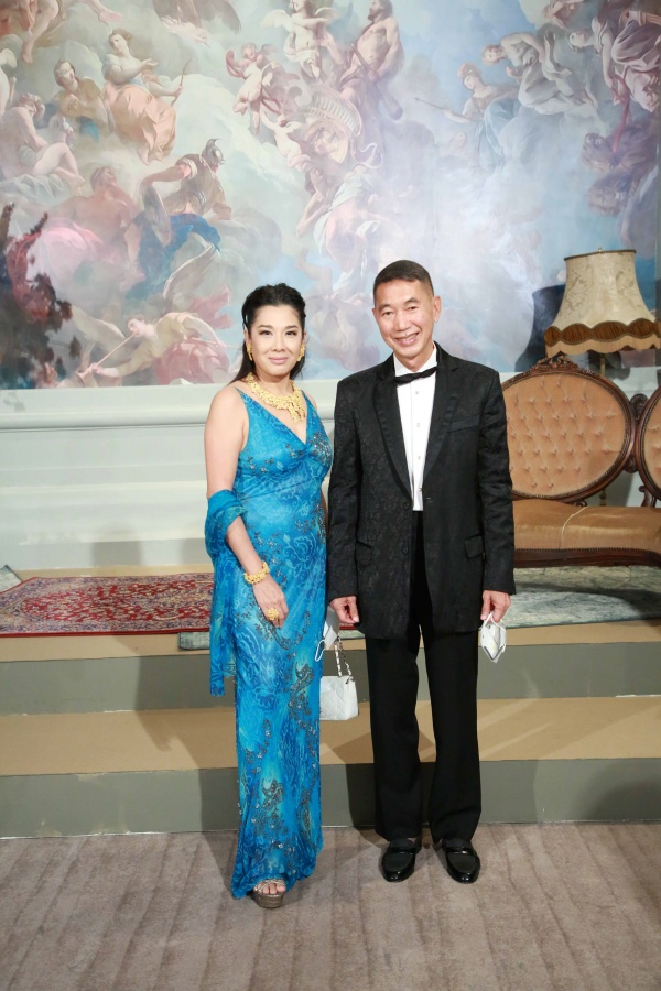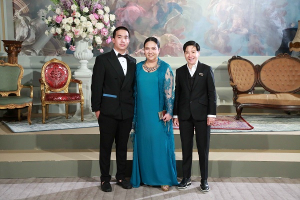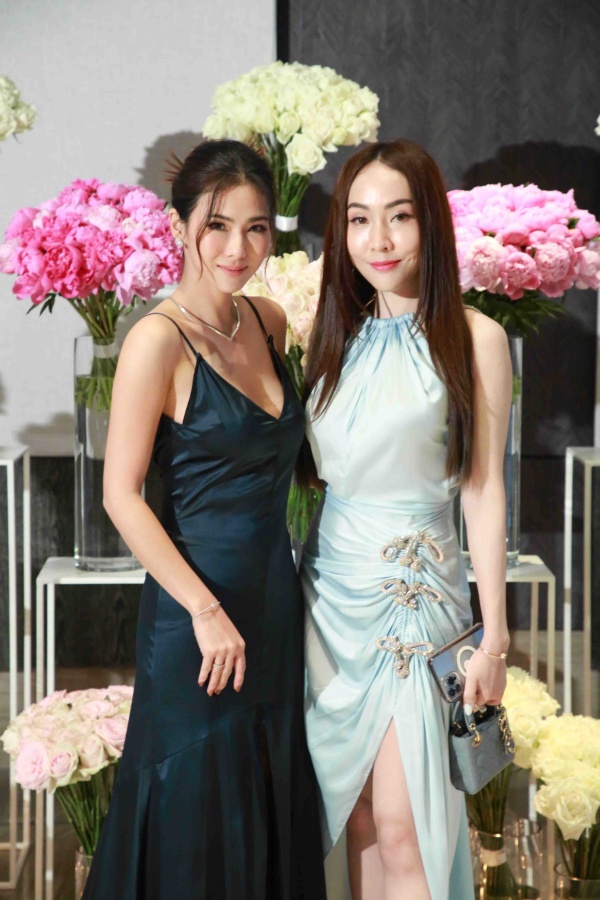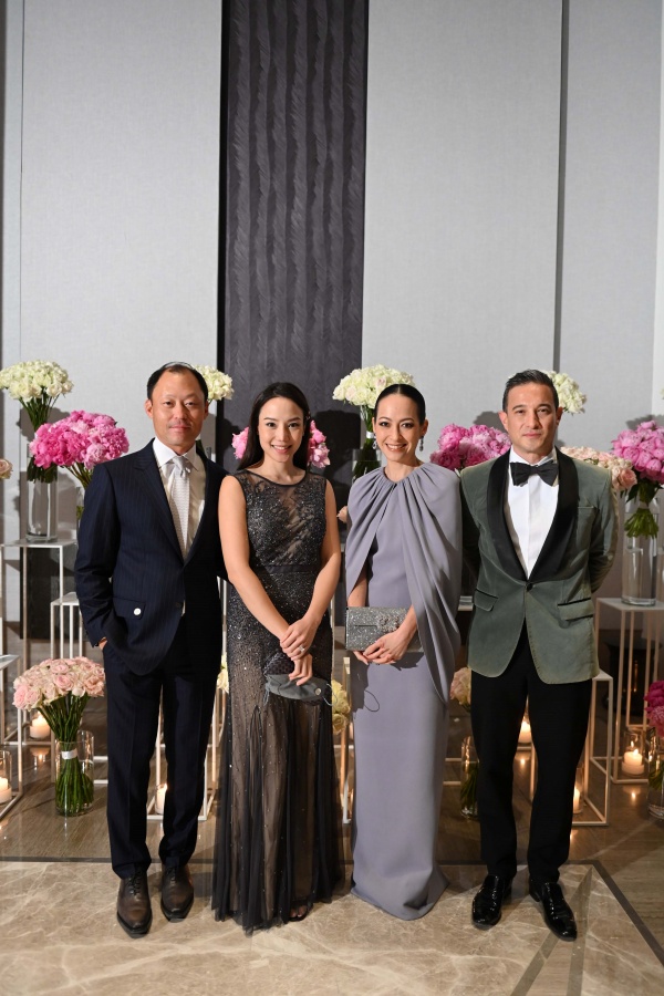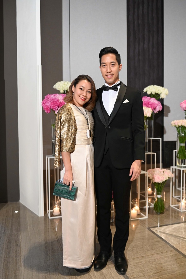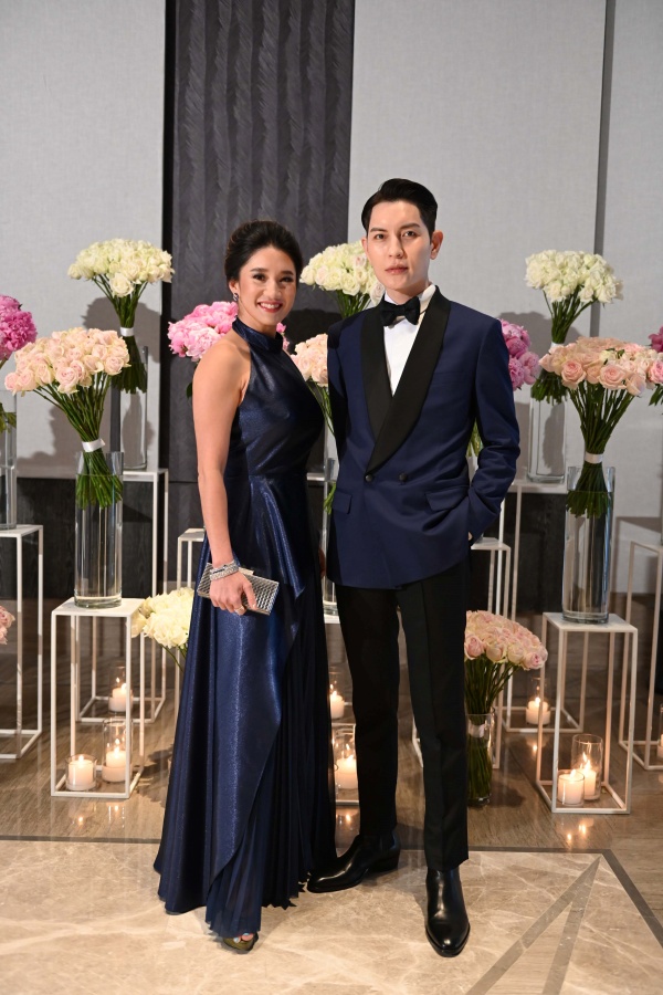 ต่อมาเวลา 18.00 น. สำหรับพิธีช่วงเย็น เจ้าสาวเลือกสวมชุดของแบรนด์ Zuhair Murad ประดับดอกไม้ตกแต่งคริสตัล ช่วงเอวเป็นผ้าทูลล์ สวมต่างหูเพชรระย้าจาก Beauty Gems และสวมรองเท้าแบรนด์ Gina สง่างามเข้ากับ ชุดทักซิโดสีดำสุดเนี้ยบของเจ้าบ่าว จากแบรนด์ Tom Ford บรรยากาศภายในห้องบอลรูม เทอร์เรซ โฟร์ซีซั่นส์ แกรนด์ บอลรูม (ชั้นล็อบบี้) โรงแรมโฟร์ซีซั่นส์ ริมแม่น้ำเจ้าพระยา กรุงเทพฯ อบอวลไปด้วยความรัก ความสวยงามของ มวลดอกไม้นานาพรรณ ตกแต่งในสไตล์ยุโรป-เวสเทิร์น ประดับด้วยคริสตัลสุดอลังการ สร้างความโรแมนติกและสวยงามดุจเทพนิยาย นอกจากนั้นยังมีศิลปินดีว่าของเมืองไทย “เจนนิเฟอร์ คิ้ม” ขับร้องเพลงรักสร้างความอบอุ่นตลบอบอวลไปทั้งงาน พร้อมส่งเวทีให้กับวงพาร์คินสัน ช่วงอาฟเตอร์ปาร์ตี้ ทั้งนี้แขกผู้มีเกียรติที่มาร่วมเป็นสักขีพยาน จะได้รับเซ็ตสบู่สารสกัดจากธรรมชาติเพื่อผิวสวย 4 สูตร จากแบรนด์ “มาดามหลุยส์” ซึ่งเป็นธุรกิจใหม่ของฝ่ายเจ้าสาว เป็นของชำร่วยที่ระลึก