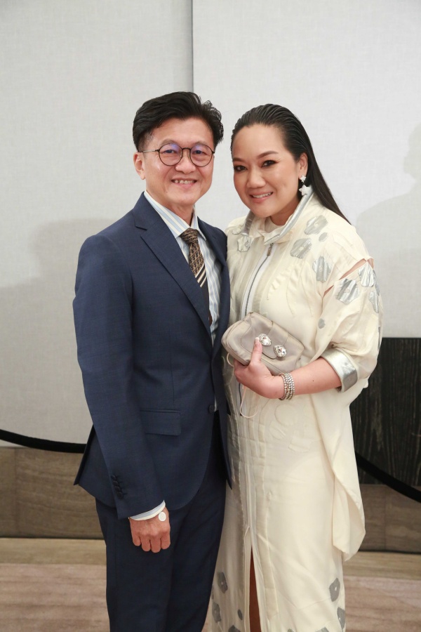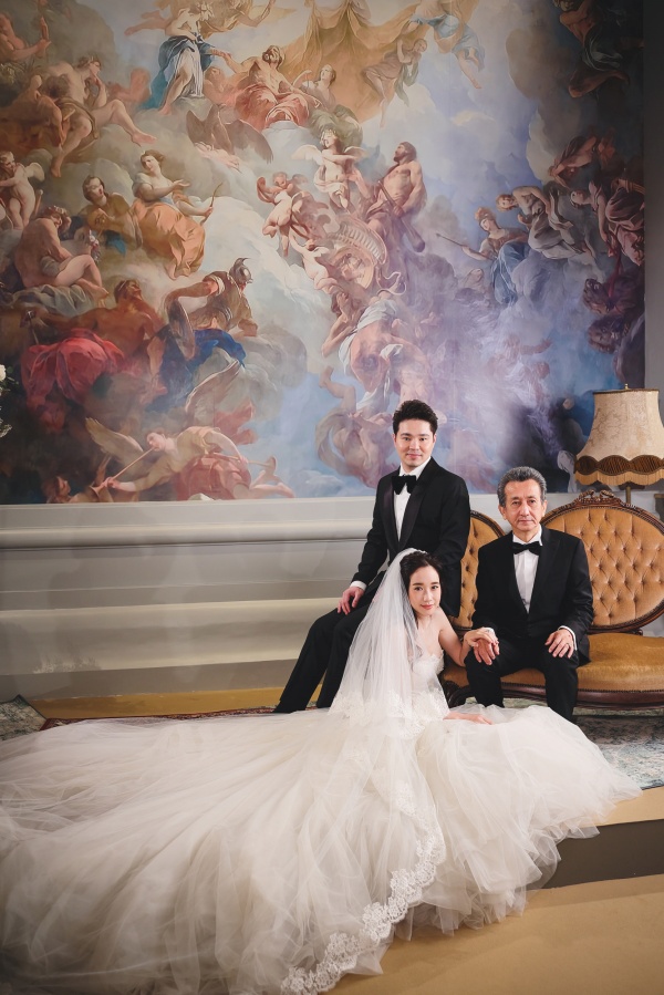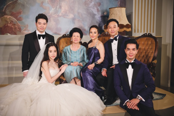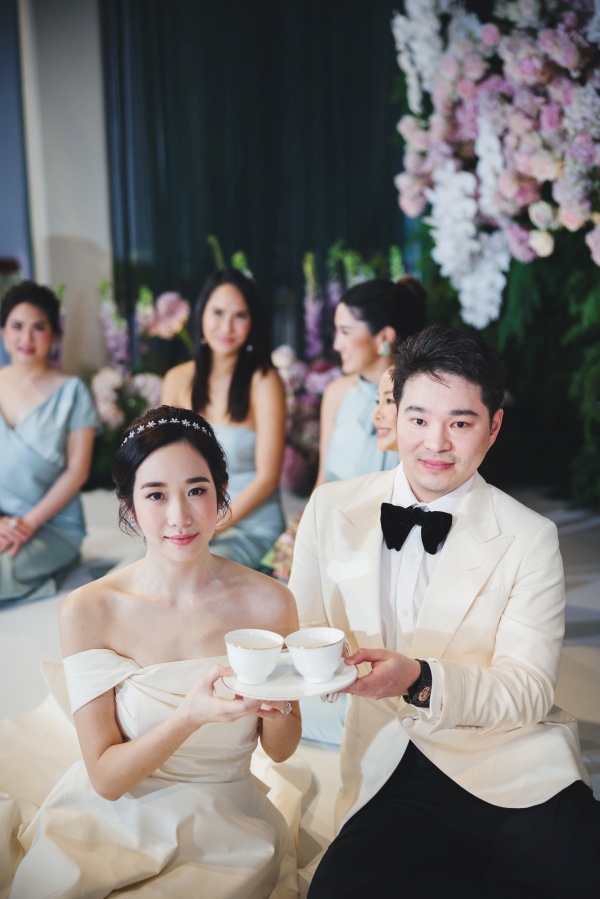 พิธีช่วงเช้ามีการยกขบวนขันหมากมาเจรจาสู่ขอ เจ้าสาวสวยสง่าในชุดสีไอวอรีสั่งตัดพิเศษ คู่กับรองเท้าส้นสูง Jimmy Choo ดูเปล่งประกายด้วยเครื่องประดับเป็นต่างหูเพชรเอเมอรัลคัตต์ ขณะที่เจ้าบ่าวดูเนี้ยบในชุดทักซิโดสีขาวจาก Tom Ford เพื่อเข้าสู่พิธีหมั้น มีฤกษ์สวมแหวนเจ้าสาวเวลา 08.59 น. ด้วยแหวนเพชรเม็ดงามจาก Graff และในเวลา 09.25 น. บ่าว-สาวก็ได้เข้าพิธียกน้ำชาตามประเพณีจีน ที่ชั้น 3 ห้อง The Conservatory โรงแรมโฟร์ซีซั่นส์