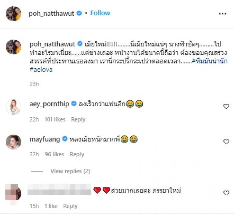 ล่าสุด หนุ่มป๋อ โพสต์ภาพภาารยาลงอินสตราแกรม @poh_natthawut ที่แต่งหน้าจัดเต็ม ทำผมเรียบง่ายแต่งสวยดึงดูดสุด ๆ พร้อมแคปชั่นอวยเมียว่า “เมียใหม่!!!!!!……..นี่เมียใหม่แน่ ๆ นางฟ้าชัด ๆ………ไปทำอะไรมาเนี่ยะ…..แต่ช่างเถอะ หน้างานได้ขนาดนี้ถือว่า ต้องขอบคุณสรวงสวรรค์ที่ประทานเธอลงมา เรานี่กระปรี้กระเปร่าตลอดเวลา…….#หืมมันน่านัก #aelova”