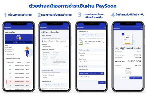 11 พฤษภาคม 2565, กรุงเทพฯ – เพย์ ซูน (PaySoon) โดย บริษัท เพย์โซลูชั่น จำกัด ผู้ให้บริการระบบชำระเงินออนไลน์แห่งแรกของประเทศไทย หวังช่วยการฟื้นตัวทางเศรษฐกิจและสร้างนวัตกรรมให้ธุรกิจดิจิทัลของไทย เปิดตัว เพย์ ซูน (PaySoon) เทคโนโลยีเสริมสภาพคล่องทางการเงินให้ธุรกิจไทย จับมือ วีซ่า ผู้นำการให้บริการการชำระเงินดิจิทัลระดับโลก และ ธนาคารกรุงเทพ จำกัด (มหาชน) เพิ่มโอกาสและช่วยให้องค์กรสามารถดำเนินธุรกิจได้อย่างต่อเนื่อง ด้วยระบบการชำระเงินออนไลน์ระหว่างผู้ขายกับผู้ชื้อที่เป็นนิติบุคคล ผ่านบัตรเครดิตนิติบุคคล ขยายระยะเวลาการชำระเงิน และเร่งเวลาการรับเงินรวดเร็วขึ้น ช่วยสร้างสภาพคล่อง ลดต้นทุนบริหารจัดการ พร้อมปลอดค่าบริการแรกเข้าและค่าบริการรายเดือน มีเพียงค่าธรรมเนียมเฉพาะธุรกรรมที่ใช้จ่ายจริงเท่านั้น