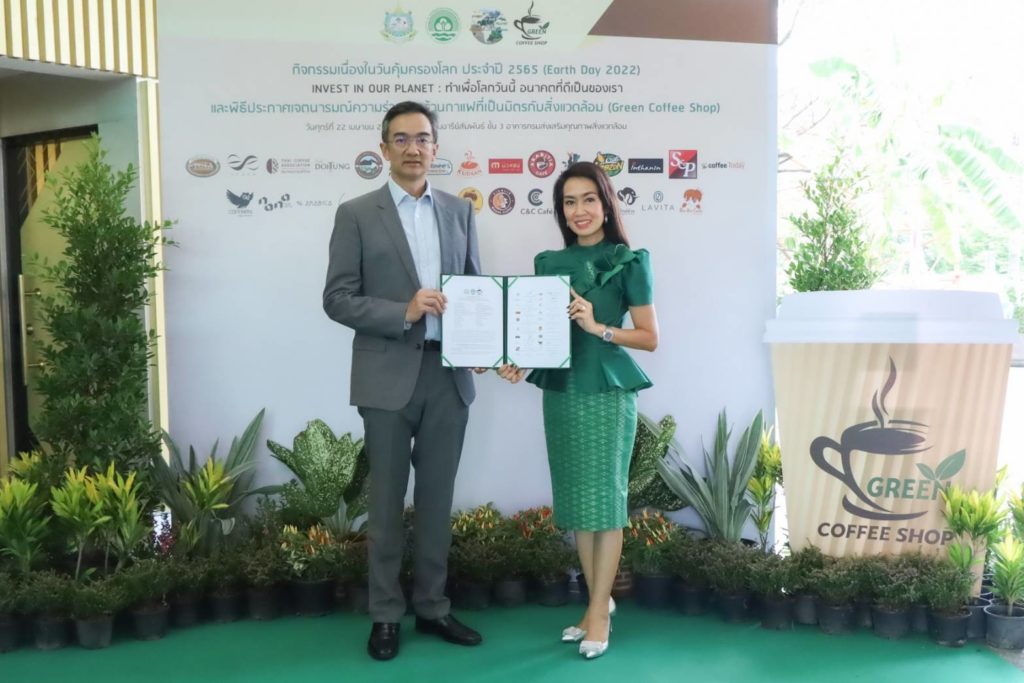 คุณมณีสุดา ศิลาอ่อน (ขวา) ประธานเจ้าหน้าที่สำนักพัฒนาความยั่งยืนและสื่อสารองค์กร และคุณกำธร ศิลาอ่อน (ซ้าย) กรรมการผู้จัดการใหญ่สายการผลิตและการเงิน บริษัท เอส แอนด์ พี ซินดิเคท จำกัด (มหาชน) ประกาศเจตนารมย์ความร่วมมือ “ร้านกาแฟที่เป็นมิตรกับสิ่งแวดล้อม” (Green Coffee Shop) ร่วมกับกระทรวงทรัพยากรธรรมชาติและสิ่งแวดล้อม โดยกรมส่งเสริมคุณภาพสิ่งแวดล้อม ในกิจกรรมเนื่องในวันคุ้มครองโลก ประจำปี 2565 ( Earth Day 2022) Invest in our planet: ทำเพื่อโลกวันนี้ อนาคตที่ดีเป็นของเรา โดยมีเป้าหมายส่งเสริมการมีส่วนร่วมในการผลิต การบริการ และการบริโภคที่เป็นมิตรกับสิ่งแวดล้อม ตามหลักเศรษฐกิจหมุนเวียน (Circular Economy) ภายในงานมี คุณวราวุธ ศิลปอาชา รัฐมนตรีว่าการกระทรวงทรัพยากรธรรมชาติและสิ่งแวดล้อม เป็นประธาน ณ กรมส่งเสริมคุณภาพสิ่งแวดล้อม เมื่อเร็ว ๆ นี้