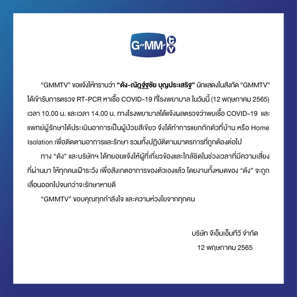 “GMMTV” ขอแจ้งให้ทราบว่า “ดัง-ณัฎฐ์ฐชัย บุญประเสริฐ” นักแสดงในสังกัด GMMTV พบเชื้อ COVID-19″Dunk” Natachai Boonprasert tests positive for Covid-19