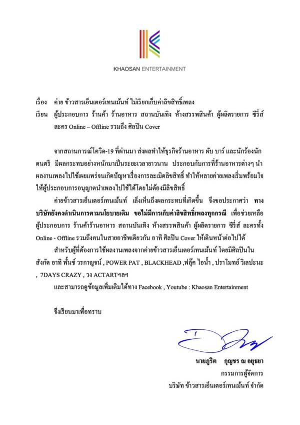 หลังประกาศเดินหน้าอย่างเป็นทางการตามนโยบายค่ายข้าวสารเอ็นเตอร์เทนเม้นท์ นำโดย นาย ภูริต กุญชร ณ อยุธยา กรรมการผู้จัดการ ในเรื่องการไม่เก็บค่าลิขสิทธิ์เพลงทุกกรณี เพื่อช่วยเหลือธุรกิจร้านอาหาร ผับ บาร์และนักร้องนักดนตรี ที่ได้รับผลกระทบอย่างหนักเป็นเวลานานจากสถานการณ์โควิด-19 เพื่อเป็นการแบ่งเบาผู้ประกอบการ ธุรกิจร้านอาหารทุกประเภท สถานบันเทิง ห้างสรรพสินค้า ผู้ผลิตรายการ ซีรีส์ ละครทั้งออนไลน์และออฟไลน์ รวมถึงนักร้องนักดนตรี สามารถนำบทเพลงจากค่ายไปร้องได้ฟรีแบบไม่มีค่าลิขสิทธิ์ เพื่อสร้างความสุขความสนุกให้กับคนฟังได้อย่างเต็มที่ จนได้รับความสนใจจากผู้ประกอบการมากมาย