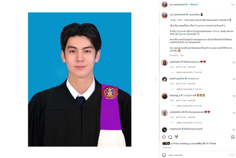 “จบแล้วครับบ 19 พค. 13:00 – 16:00 คณะวารสารศาสตร์ ธรรมศาสตร์ ท่าพระจันทร์ เรียนเชิญ พ่อแม่พี่น้อง เพื่อน Ryupower ทุกคนมาเจอกันนะค้าบ สำหรับ Ryupower เดี๋ยวเราไปจุดรวมพลกันตอน 14:30 น. นะครับ ติดตามได้ใน @ryupower ได้เลยครับ สถานที่อาจจะไม่ได้อยู่หน้าคณะตลอดเวลา ยังไงถ้าติดต่อริวไม่ได้ติดต่อเบอร์หม่าม๊าริวใน bio ได้เลยนะครับ ปล. ขออนุญาตงดรับดอกไม้และของกินนะค้าบบ แค่มาเจอกันก็ดีใจมาก ๆ แล้วครับ”