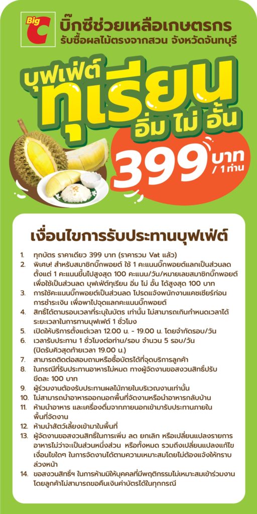 นายอัศวิน เตชะเจริญวิกุล ประธานเจ้าหน้าที่บริหารและกรรมการผู้จัดการใหญ่ บริษัท บิ๊กซี ซูเปอร์เซ็นเตอร์ จำกัด (มหาชน) ห้างค้าปลีกในกลุ่มบีเจซี เปิดเผยว่า“ขณะนี้เป็นช่วงผลไม้ฤดูกาลที่มีแนวโน้มออกสู่ตลาดจำนวนมาก ล่าสุด บิ๊กซี จัดกิจกรรม “บุฟเฟ่ต์ทุเรียนอิ่มไม่อั้น” ราคาเดียว 399 บาท จัดขึ้นตั้งแต่วันที่ 14 – 22 พฤษภาคม 2565 เพื่อช่วยเหลือและสนับสนุนการบริโภคผลไม้ไทยภายในประเทศซึ่งจะเป็นส่วนช่วยเติมเต็มให้ลูกค้าได้มีโอกาสอุดหนุนสินค้าส่งตรงจากสวนเกษตรกรไทย และเพื่อให้เกษตรกรไทยมีรายได้และได้มีช่องทางการจำหน่ายสินค้า ในปีนี้ บิ๊กซี รับซื้อผักผลไม้ไทยทุกฤดูกาลกว่า 4,000 ตัน จัดจำหน่ายที่บิ๊กซีทุกสาขาทั่วประเทศ ตอกย้ำนโยบาย บิ๊กซี เพื่อนที่ดีของเกษตรกรไทย”