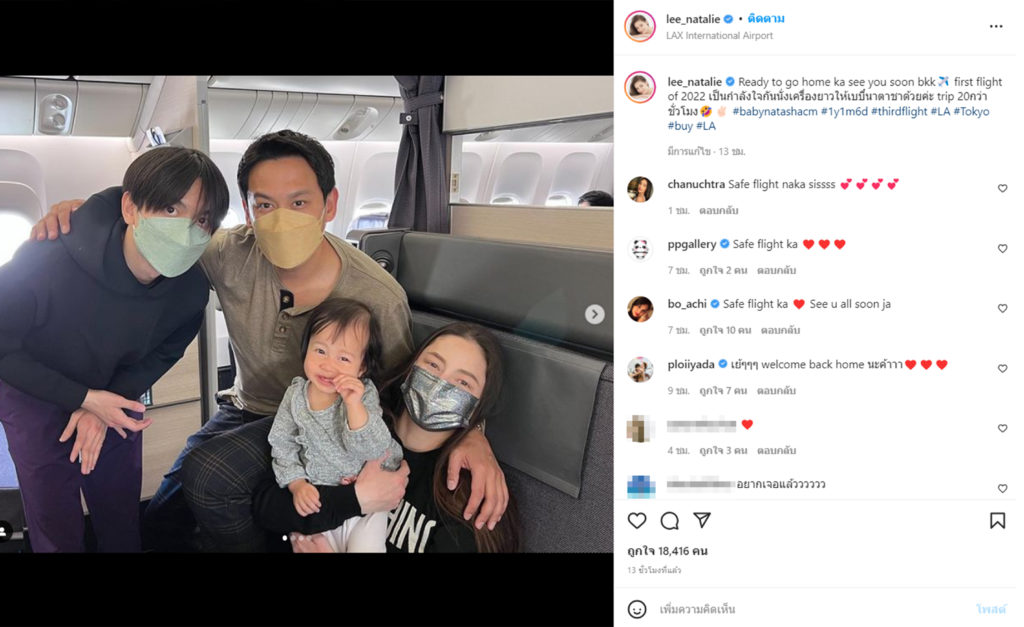 ล่าสุด ฟลุค-ลี ก็ตัดสินใจพาครอบครัวบินกลับบ้านเกิดเมืองไทยแล้ว โดย นาตาลี ได้เผยภาพพร้อมข้อความระบุว่า “Ready to go home ka see you soon bkk first flight of 2022 เป็นกำลังใจกันนั่งเครื่องยาวให้เบบี๋นาตาชาด้วยค่ะ trip 20กว่าชั่วโมง #babynatashacm #1y1m6d #thirdflight #LA #Tokyo #buy #LA“