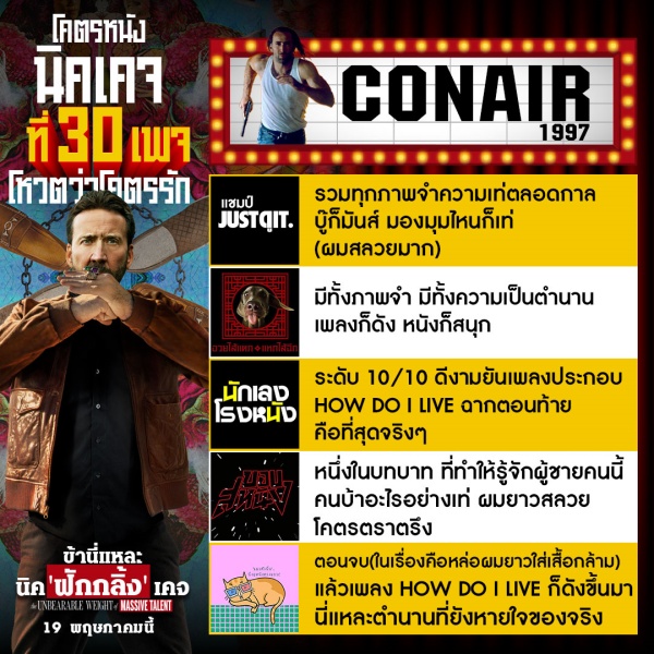 เริ่มที่เรื่องแรกอย่าง CONAIR (1997) ภาพยนตร์แอ็กชั่น-ทริลเลอร์ที่ได้รับเสียงยืนยันในเรื่องความเป็น “ตำนาน” ไม่ว่าจะเป็นงานภาพ เสียง และการแสดง รวมไปถึง “ผมยาวสลวย” ของนิค เคจ ที่ตรึงใจเหล่าคอหนังชั้นนำของเรา ไม่ว่าจะเป็นคุณแชมป์ JUST ดู IT, อวยไส้แตกแหกไส้ฉีก, นักเลงโรงหนัง, ขอบสหนัง และแมวตัวนั้นนั่งดูหนังตรงแถว C
