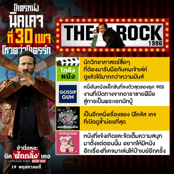ต่อมาคือเรื่อง THE ROCK (1996) ภาพยนตร์แอ็กชั่น-ทริลเลอร์ ผจญภัย ที่ทำให้ “นิโคลัส เคจ” แจ้งเกิดเป็นนักแสดงสายบู๊คุณภาพ และมีงานสายแอ็กชั่นตามมาอีกนับไม่ถ้วน การันตีความสนุกโดย โกดังหนัง, GOSSIP GUN, หนังใหม่ชนโรง และหนังหมูกรอบ