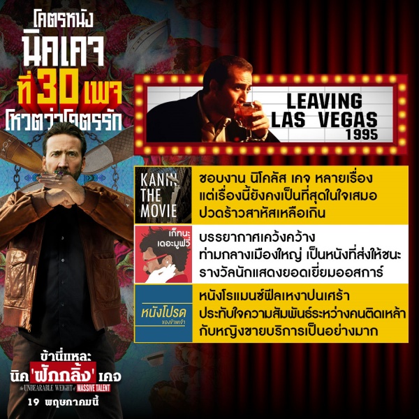 Leaving Las Vegas (1995) ภาพยนตร์โรแมนติก-ดราม่า ที่ส่งให้ นิโคลัส เคจ ได้รับรางวัลออสการ์ในสาขานักแสดงนำชายยอดเยี่ยมเป็นครั้งแรก ไม่ว่าจะด้วยความโรแมนติกเหงา ๆ ปนเศร้า หรือจะด้วยความปวดร้าวที่ออกมาจากการแสดงของเขาก็ตาม จึงทำให้หนังเรื่องนี้ เป็นหนังในดวงใจของ Kanin The Movie, เก็ทนะ เดอะ มูฟวี่ และ หนังโปรดของข้าพเจ้า ได้อย่างไม่มีข้อกังขา