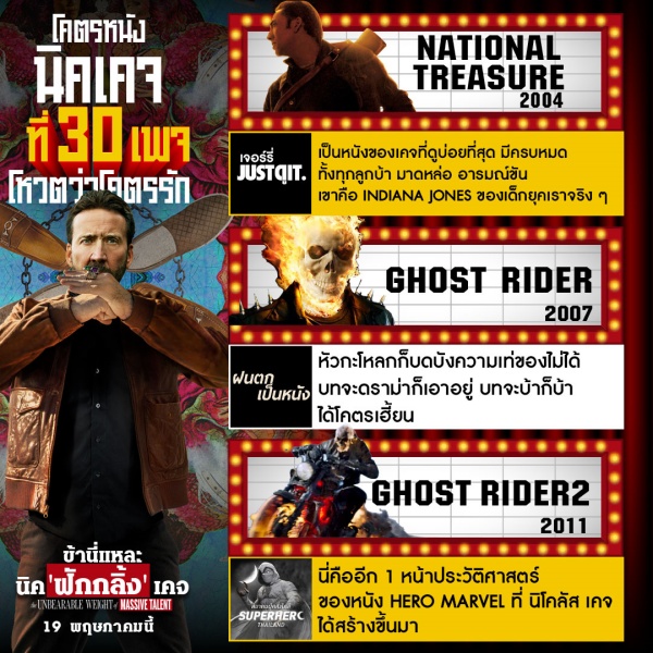 Ghost Rider (2007) ภาพยนตร์แอ็กชั่นในตำนาน ที่ ฝนตกเป็นหนัง ยังบอกว่าเท่ชนิดที่ว่า หัวกะโหลกก็บังไม่มิด รวมไปถึง Ghost Rider 2 (2011) ที่ สมาคมผู้คลั่งไคล้ Superhero ยกให้เป็นประวัติศาสตร์หนังฮีโร่ ที่ นิค เคจ สร้างไว้ให้กับ Marvel