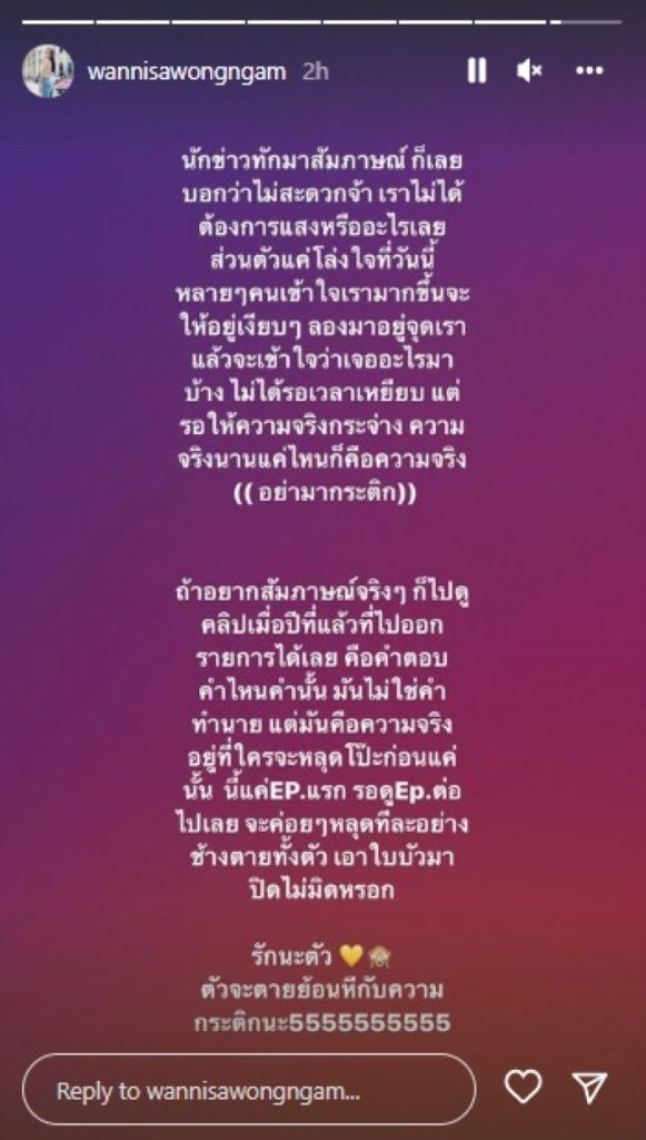 โดยเธอเผยว่า “นักข่าวทักมาสัมภาษณ์ ก็เลยบอกว่าไม่สะดวกจ้า เราไม่ได้ต้องการแสงหรืออะไรเลย ส่วนตัวแค่โล่งใจที่วันนี้หลายๆคนเข้าใจเรามากขึ้นจะให้อยู่เงียบ ๆ ลองมาอยู่จุดเราแล้วจะเข้าใจว่าเจออะไรมาบ้าง ไม่ได้รอเวลาเหยียบ แต่รอให้ความจริงกระจ่าง ความจริงนานแค่ไหนก็คือความจริง ((อย่ามากระดิก))