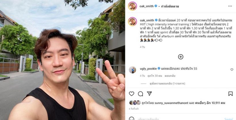 โดยหมอโอ๊คเผยผ่านอินสตราแกรมว่า “มีเวลาน้อยแค่ 20 นาที ก่อนมาตรวจคนไข้ เลยจัดโปรแกรม HIIT ( high intensity interval training ) ให้ตัวเอง เริ่มด้วยวิ่งเหยาะ ๆ 2 นาที พัก 2 นาที วิ่งเร็วขึ้น 1.30 นาที พัก 1.30 นาที วิ่งเกือบเร็วสุด 1 นาที พัก 1 นาที และ sprint เร็วที่สุด 30 วินาที พัก 30 วินาที แล้วจึงไล่ลงตามลำดับอีกครั้ง ได้ afterburn ลดน้ำหนักได้เร็วมากครับ ลองทำดูกันนะครับ”