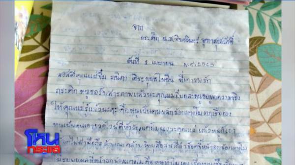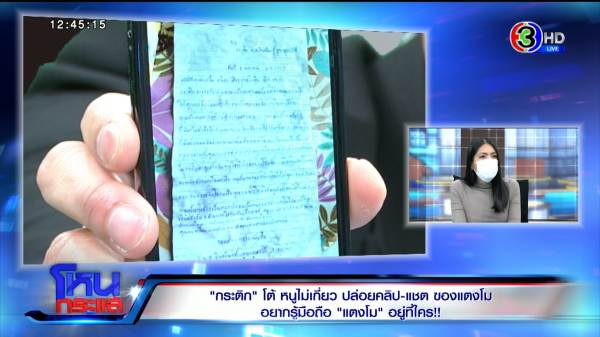 กระติก : ใช่ค่ะ แม่ส่งมาให้ ซึ่งก่อนส่งมา ได้เข้าไปที่ตร.แล้วเรียบร้อย เรื่องผ่านไปเป็นอาทิตย์แล้ว แม่ส่งกลับมาซ้ำอีก หนูเข้าไปพิสูจน์ลายมือ แสดงความบริสุทธิ์ใจ มีตร.อัดถ่ายคลิปตอนติกเขียน คุณแม่ก็นั่งอยู่อีกห้อง ติกก็อยู่อีกห้อง ตรงนั้นก็จบไปแล้ว ตร.ไปสืบต่อว่าใครเป็นคนส่งมาหรือยังไง หลังจากนั้นติกไม่ทราบว่าคุณแม่ยังติดใจอะไรอยู่มั้ย ถึงส่งมาถามซ้ำในเรื่องเดิม ติกก็มีการชี้แจงไปแล้วกับคุณแม่ อธิบายเป็นข้อๆ ทำไมเขาถึงรู้ชื่อจริงกับคุณแม่ ติกก็อธิบายคุณแม่ไปแล้วว่าคุณแม่ออกสื่อบ่อยอยู่แล้ว