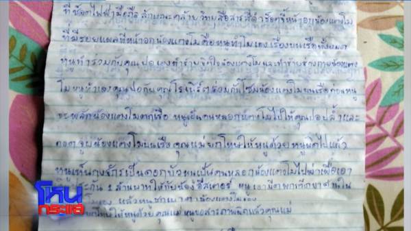 ในจดหมายบอกว่าหนูทำเรื่องกับคุณปอ ทำร้ายจิตใจน้องแตงโม ทำร้ายร่างกายน้องแตงโมคุณปอ-โรเบิร์ต ช่วยกันโทรมน้อง ก่อนผลักน้องแตงโมตกเรือ หนูหลอกแตงโมให้คุณปอปล้ำ กอดจูบบนเรือ แม่ยกโทษให้หนูด้วย หนูเป็นคนหลอกแตงโมไปฆ่าเอาเงินประกัน 1 ล้านให้น้องอีสเตอร์ หนูกรีดขาด้านในน้องแตงโมเอง และหนูชกเบ้าตาน้องแตงโมเอง คุณแม่ยกโทษให้หนูด้วย หนูขอสารภาพผิด อันนี้คุณไม่ได้เขียน?