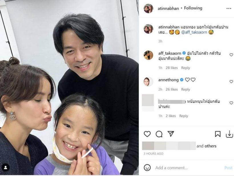 ต่อมาได้ เอ ทินพันธ์ ได้โพสต์ภาพถ่าย เเอน ทองประสม เเละ น้องปีใหม่ พร้อมเเคปชั่นว่า “แอนทอง บอกให้อุ้มกลับบ้านเลย“ ซึ่ง แม่แอฟ ก็มาตอบว่า “อุ้มไปไม่กลัว กลัวรีบอุ้มมาคืนน่ะสิคะ” 😂😂