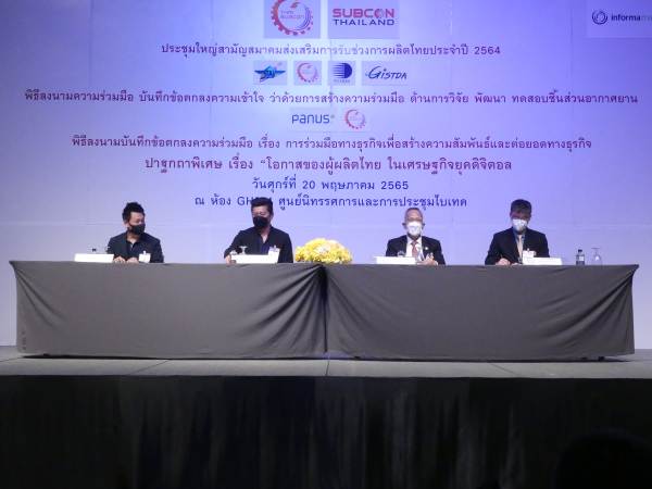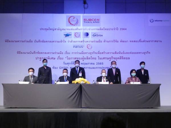 วันที่ 20 พฤษภาคม 2565 ในงานประชุมใหญ่สามัญสมาคมส่งเสริมการรับช่วงการผลิตไทยประจำปี 2564 ณ ห้อง Grand Hall 201ศูนย์การประชุมและนิทรรศการไบเทค สมาคมส่งเสริมการรับช่วงการผลิตไทย (Thai Subcon) ผนึกกำลังร่วมกับหน่วยงานพันธมิตรทั้ง 3 หน่วยงาน ได้แก่ สถาบันวิจัยวิทยาศาสตร์และเทคโนโลยีแห่งประเทศไทย (วว.) สำนักงานพัฒนาเทคโนโลยีอวกาศและภูมิสารสนเทศ (องค์การมหาชน) (GISDA) และบริษัทอุตสาหกรรมการบิน จำกัด (TAI) จัดพิธีลงนาม MOU ร่วมมือกัน ในการส่งเสริมและพัฒนาการดำเนินธุรกิจของแต่ละฝ่ายเพื่อร่วมมือกันพัฒนาขีดความสามารถของทั้งสี่ฝ่ายในส่วนที่เกี่ยวข้องกับอุตสาหกรรมการบินให้เกิดประสิทธิภาพและประสิทธิผลสูงสุดในการผลักดันการพัฒนาประเทศตามยุทธศาสตร์ชาติ โดยเฉพาะในอุตสาหกรรมการบินและโลจิสติกส์ (S-Curve 7) และอุตสาหกรรมป้องกันประเทศ (S-Curve 11) โดยผลักดันให้เกิดการส่งเสริมการสร้าง และการผลิตชิ้นส่วนอากาศยาน บริภัณฑ์ภาคพื้น และอุปกรณ์สนับสนุนการซ่อมบำรุงอากาศยาน เพื่อสนับสนุนการซ่อมบำรุงอากาศยานพร้อมกับการสนับสนุนจากห้องปฏิบัติการที่ได้มาตรฐานในการทดสอบชิ้นงาน และให้การรับรองคุณภาพความปลอดภัยในการใช้งานตามมาตรฐาน AS9100D ทำให้ผู้ใช้งานมีความเชื่อมั่นในคุณภาพ และความปลอดภัยในชิ้นส่วนอากาศยานที่ผลิตภายในประเทศ