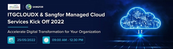 ทั้งนี้ ซังฟอร์ เทคโนโลยีกำลังจะจัดสัมมนาออนไลน์ในหัวข้อ ITGCLOUDX & Sangfor MCS kick-off 2022 ขึ้นเร็ว ๆ นี้ สามารถลงทะเบียนเข้าร่วมงานได้ที่ https://sangfor.zoom.us/webinar/register/7116526712881/WN_lnz4E5DETrOD5RpMSy_MVA