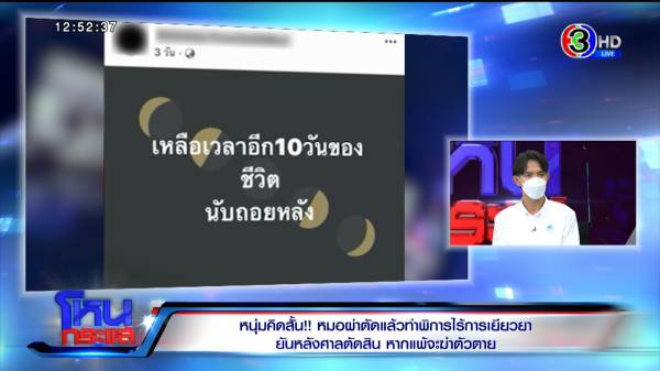 กรณี “แบงค์” ไปรักษาอาการหมอนรองกระดูกทับเส้นประสาทที่รพ.แห่งหนึ่งด้วยวิธีการผ่าตัด แต่หลังผ่าตัดกลับรู้สึกว่าปวดหัว และปวดหลังรุนแรง ต่อมาพบบริเวณไขกระดูกสันหลังมีน้ำไหลออกมาตลอดเวลา แพทย์ระบุว่ามีอาการแผลติดเชื้อ โยนความผิดให้แม่ที่ทำหน้าที่ล้างแผลอยู่ที่บ้าน หลังเข้ารับการผ่าตัดรอบสอง ปรากฏว่าขาชาไม่มีความรู้สึก ไม่สามารถเดินได้ตามปกติ สุดท้ายแพทย์ลงความเห็นว่าพิการ จนนำไปสู่การฟ้องร้องรพ. ตอนนี้ไม่กินข้าวมา 5 วันแล้ว พร้อมประกาศหากแพ้คดีจะฆ่าตัวตาย