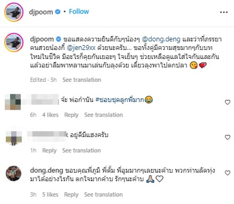 ล่าสุดวานนี้ (9 มิ.ย. 65) ด้งเด้งและสาวกี้ ควงแขนเข้าพิธีวิวาห์แล้วอย่างเรียบง่าย โดยทางด้าน ดีเจภูมิ ได้โพสต์ภาพและข้อความแสดงความยินดีว่า “ขอแสดงความยินดีกับๆน้องๆ @dong.deng และว่าที่ภรรยาคนสวยน้องกี้ @jen29xx ด้วยนะครับ… ขอทั้งคู่มีความสุขมากๆกับบทใหม่ในชีวิต มีอะไรก็คุยกันเยอะๆ ใจเย็นๆ ช่วยเหลือดูแลใส่ใจกันและกัน แล้วอย่าลืมพาหลานมาเล่นกับลุงด้วย เดี๋ยวลุงพาไปตกปลา”