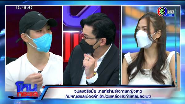เคนลี : จริง ๆ เมื่อวานเราได้เจอกันแล้วหนึ่งครั้ง และผมพูดจริงๆว่าผมไม่ประสงค์ออกรายการ ผมต้องขอโทษคุณพ่อคุณแม่ก่อน คุณพ่อคุณแม่สั่งห้ามผมมาออก เพราะเขารู้ว่าสิ่งที่จะเกิดขึ้นคืออะไร ครอบครัวพี่น้องหรือคนรู้จักผม ไม่มีใครเห็นด้วยกับการที่ผมมาออกรายการนี้ แต่สิ่งที่อยากให้รู้คือมีผู้สื่อข่าวบางสำนัก เริ่มมีการเดินทางไปที่บ้านของพ่อแม่ผม แล้วนำภาพของผมไปให้เพื่อนบ้านดูว่าบุคคลนี้อยู่บ้านหลังนี้มั้ย ผมรู้สึกว่าจากต้นคลิปที่ผมทำร้ายร่างกายผู้หญิง ที่ผมผิด เริ่มแผ่ความเดือดร้อน และคุกคามไปถึงพ่อแม่ผมแล้ว ไม่ใช่แค่พ่อแม่ผม พ่อแม่ผู้หญิงก็ตาม ครอบครัวก็ตามที่ต้องนั่งดูคลิปไม่รู้กี่ครั้งที่ปรากฎอยู่บนเฟซบุ๊ก ซึ่งเมื่อเช้านี้ผมดูล่าสุด มีคนแชร์ไปแล้วกว่า 9 หมื่นครั้ง ผมนั่งคิดว่า 9 หมื่นครั้งคนจะดูกี่คน