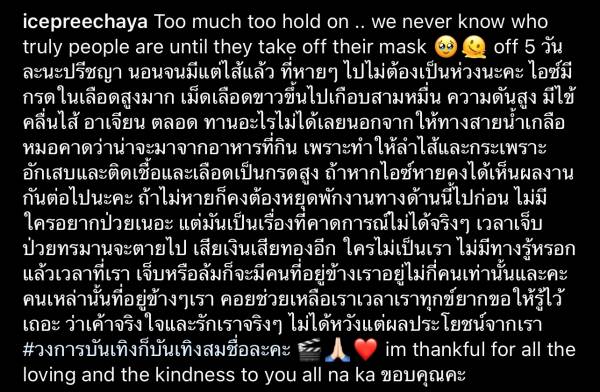ไอซ์ขอขอบคุณ พี่ ๆ เพื่อน ๆ นักแสดง แฟนคลับที่ส่งข้อความมาเป็นกำลังใจ และเป็นห่วงไอซ์มาในทุกช่องทางจริง ๆ ขอบคุณมาก ๆ นะคะ และต้องขอโทษด้วยที่ไอซ์ไม่สามารถตอบได้หมดทุกคน ขอใช้พื้นที่ตรงนี้ขอบคุณทุกคนมากจริง ๆ ค่ะ