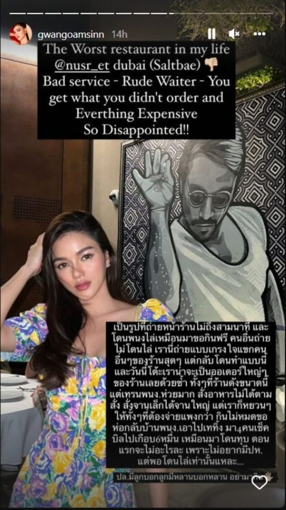 “The Worst restaurant in my life @nusr_et dubai (Saltbae) Bad service – Rude Waiter – You get what you didn’t order and Everthing Expensive So Disappointed!!”หรือแปลว่า “ร้านอาหารที่แย่ที่สุดในชีวิตของฉัน บริการแย่ – บริกรหยาบคาย – คุณได้สิ่งที่คุณไม่ได้สั่งและทุกอย่างแพง ผิดหวังมาก!!”